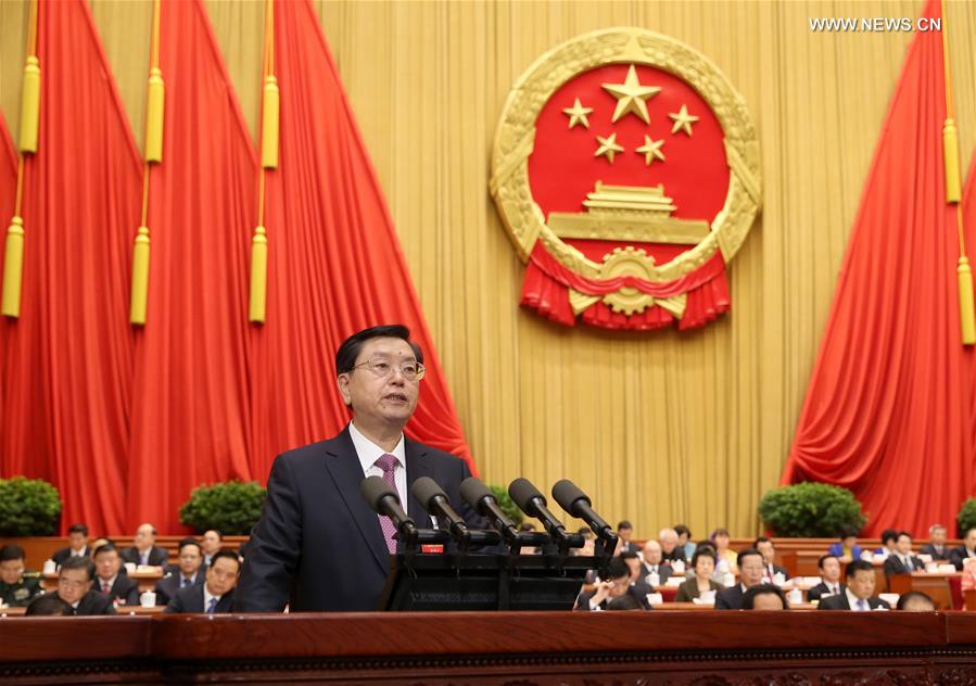 Zhang Dejiang, chairman of the Standing Committee of China's National People's Congress (NPC), delivers a report on the work of the NPC Standing Committee during the second plenary meeting of the fourth session of the 12th NPC at the Great Hall of the People in Beijing, capital of China, March 9, 2016. (Xinhua/Yao Dawei)
