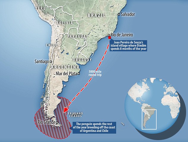 Now, Dindim spends eight months of the year with Joao and the rest of his time breeding off the coast of Argentina and Chile. The flightless bird is believed to swim around 5,000 miles every time he returns to his rescuer.