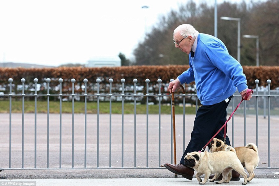 A man walked his two pugs outside the NEC in Birmingham, just one of the hundreds of breeds expected at the show