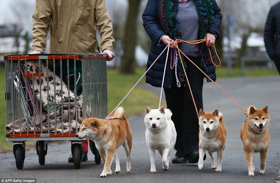 Four perfectly-groomed Japanese Shiba Inu dogs were kept on leads by their owner, who had brought a variety of accessories