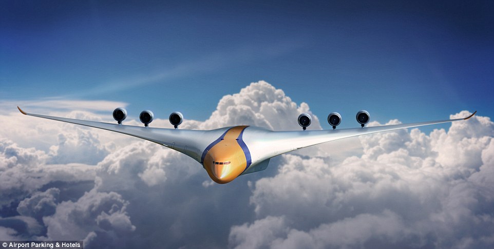 The huge curved plane is the brainchild of a team from Airport Parking & Hotels and Imperial College London, who set out to predict what the future of flight could realistically be like in 30 to 40 years.