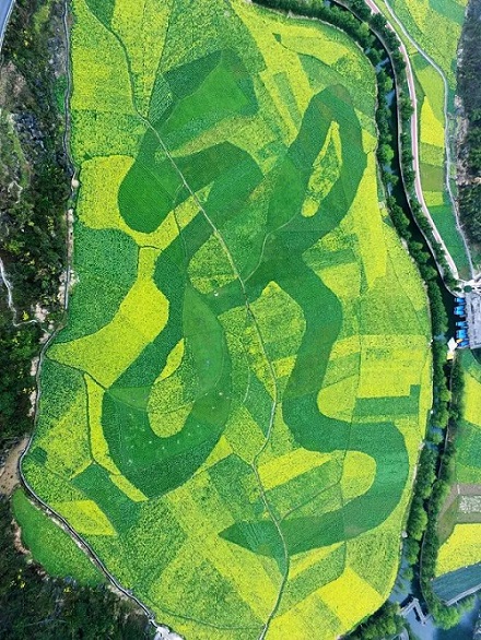 As days get warmer, rapeseed flowers bloom into sea across China. Photos taken on March 12, 2016 show a giant Chinese character meaning “dragon” (龍) drawn in an 80,000-square-meter rapeseed flower field in Anshui, southwest China’s Guizhou province.