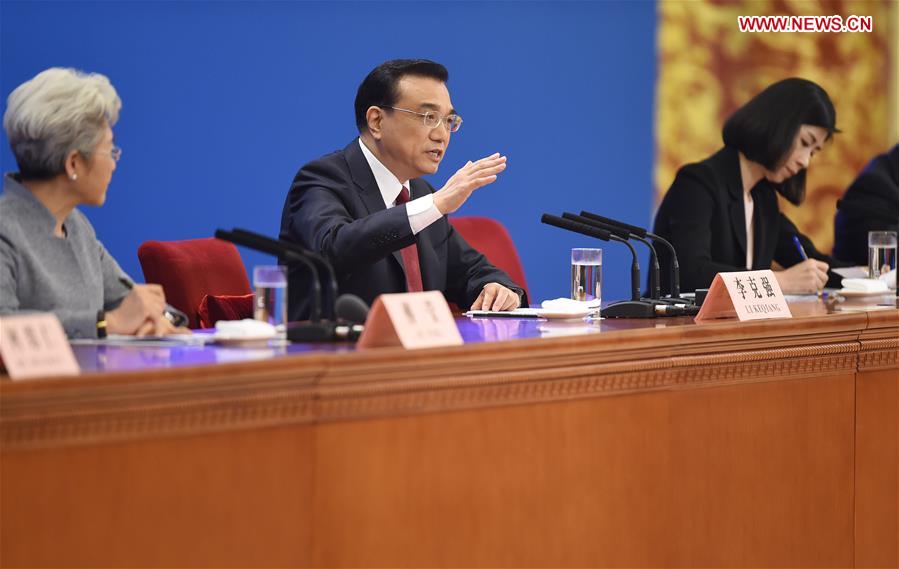 Chinese Premier Li Keqiang (C) speaks at a press conference at the Great Hall of the People in Beijing, capital of China, March 16, 2016. (Xinhua/Chen Yehua)