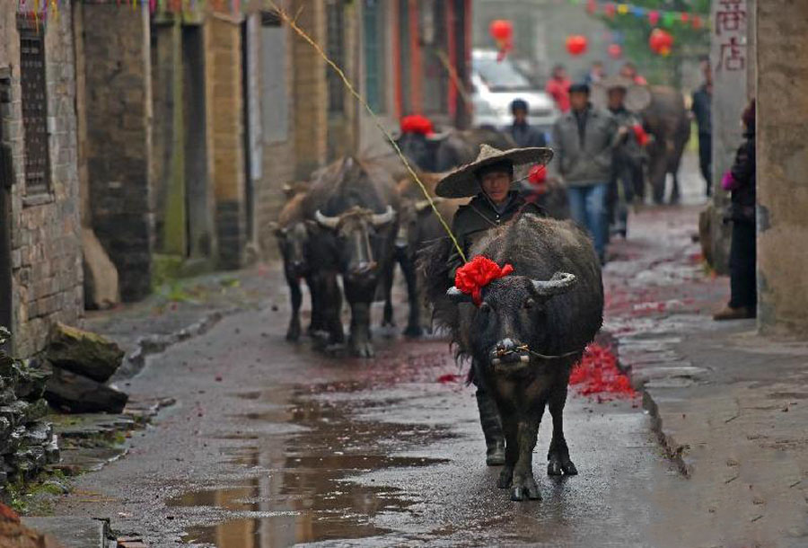 This practice is popular in the southern area of the lower reaches of the Yangtze River. As the Spring Equinox comes, farm work starts and both the farmers and the cattle start to become busy. Farmers will reward cattle with sticky rice balls to express their gratefulness. Meanwhile, people will also make sacrifice to birds, to thank them for bringing signals for farm work and to ask them not to eat grains later in the year.