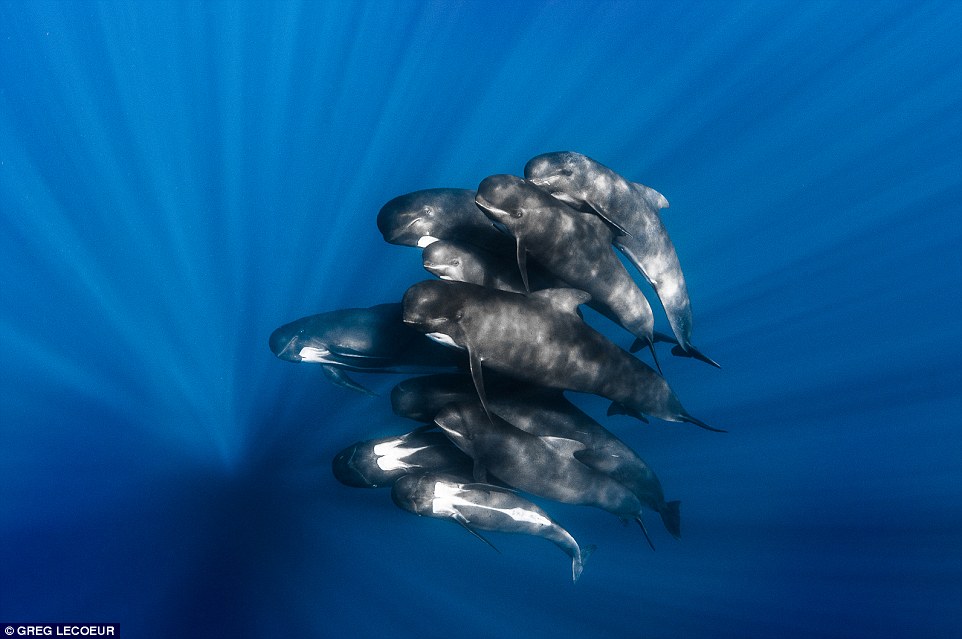 French photographer Greg Lecoeur also snapped this mesmerising image of a pod of pilot whales circling beneath the surface