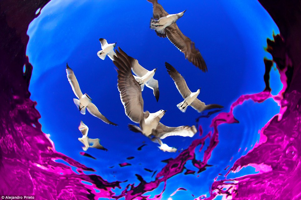 Alejandro Prieto from Mexico, who took this amazing picture, said: 'Returning from a dive with bull sharks in Playa del Carmen in Mexico, I saw a beautiful flock of seagulls flying very low over a crowded beach. They usually fly low over the people looking for food. This behaviour allowed me to try to shoot them from beneath the water. With this photograph I want to show that ordinary subjects can become extraordinary depending on the perspective you see them'