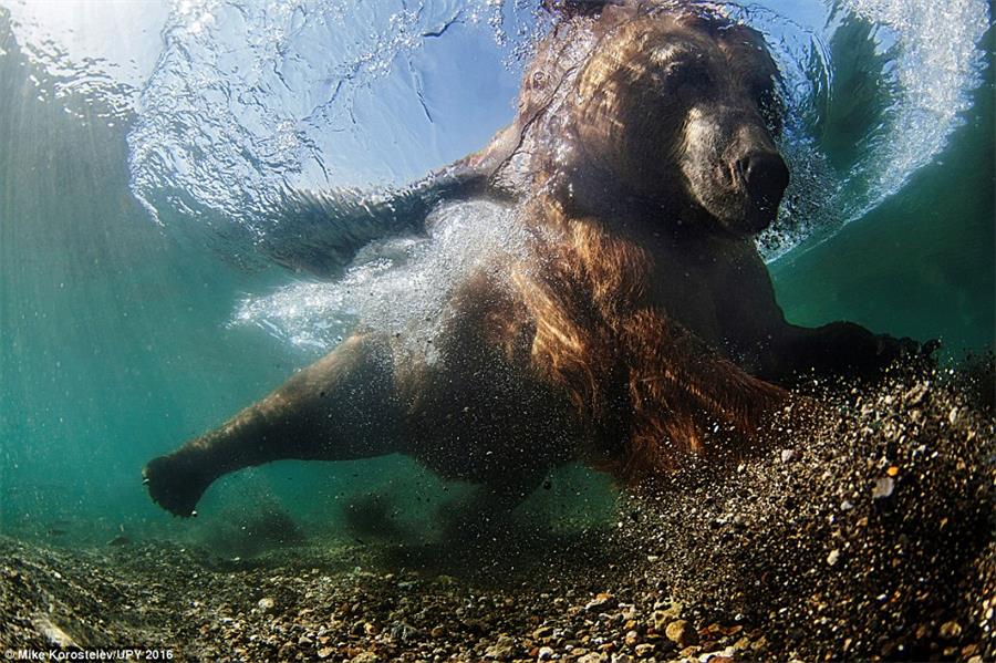 This image was taken by Mike Korostelev from Russia. He said: 'Cages are more commonly associated with photographing great white sharks, but I constructed a cage to keep me safe as I captured the fishing behaviour of the bear. I waited many hours in the cold water for the bear to come close enough to make my photo. The bear's strategy is to start by sitting down, putting his head under the water and looking for fish. Once the fish start to ignore him, he creeps closer before making his crucial lunge to snare a large salmon in his paws, or teeth'