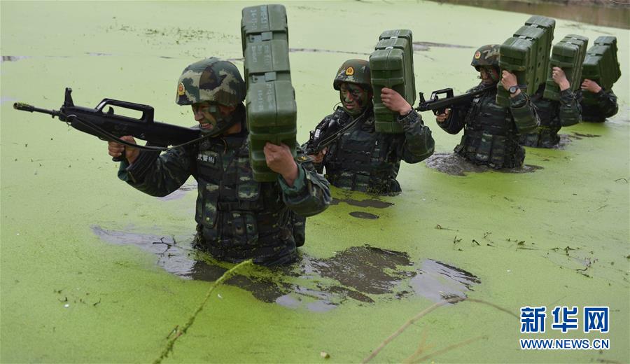 Special combat soldiers from the second detachment of Anhui People's Armed Police Corps conduct wading search training in a forest in Chaohu on March 23, 2016. On that day, the Hell Week code-named 'Hunter' entered the third day. The soldiers will face more than 30 training courses including long-range raid, jungle search, swimming in battle gear, field survival, and battlefield self-help. (Xu wei/Xinhua News Agency)