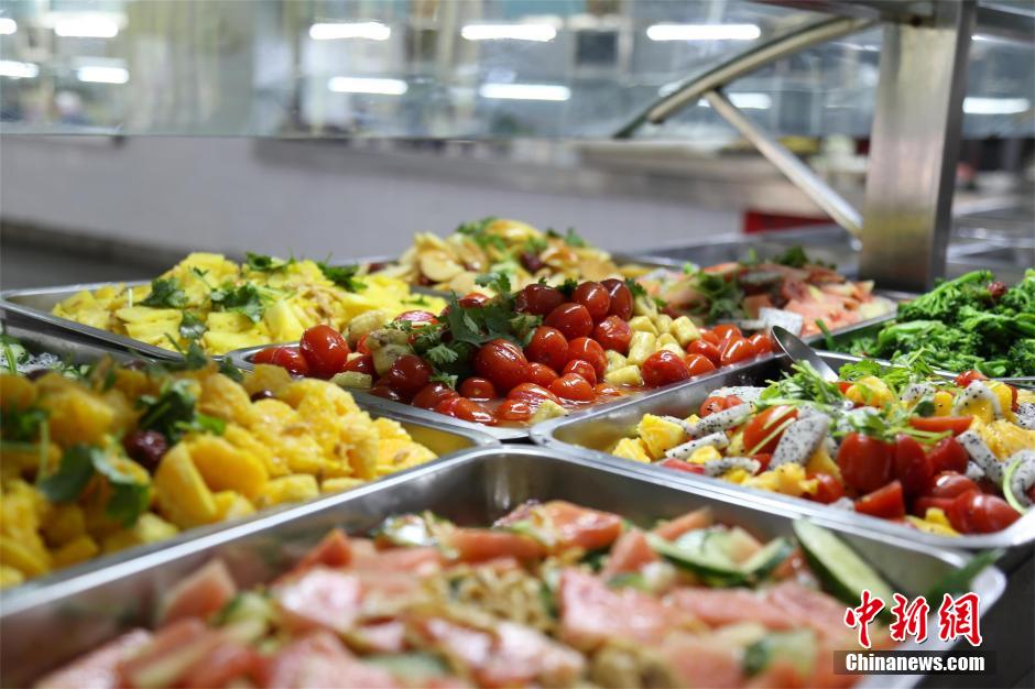 On March 23, students lined up to buy fruit dishes in a canteen of Wuchang Institute of Technology. Dishes including tangerine fried meat, cherry tomato fried bananas, watermelon fried shredded meat, pitaya fried ham sausage were served. The college has begun to serve more than 10 fruit dishes to students since March 21. Because of their bright color and unique flavor, the fruit dishes have attracted many students. According to an official in this college, the sales volume has increased 25 percent since the fruit dishes was provided. (Chen zhiming/Chinanews.com)