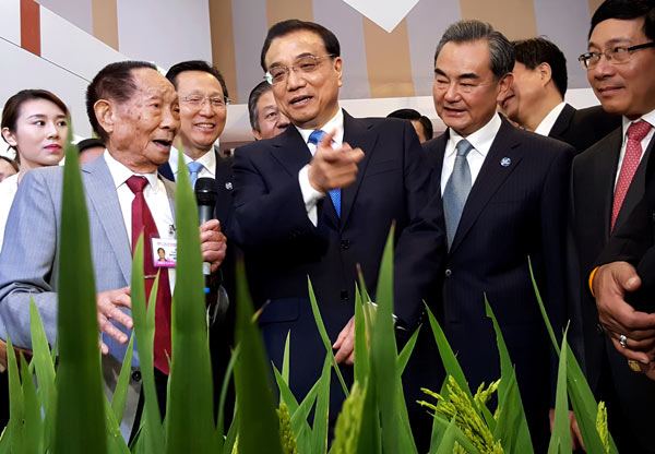 Premier Li Keqiang consults with Yuan Longping (left), known as "the father of hybrid rice", during an exhibition on Lancang-Mekong cooperation in Sanya, Hainan province, on Wednesday. (WU ZHIYI / CHINA DAILY)