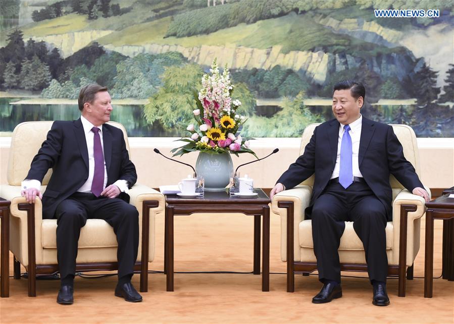 BEIJING, March 25, 2016 -- Chinese President Xi Jinping (R) meets with Russian Presidential Administration chief Sergei Ivanov at the Great Hall of the People in Beijing, capital of China, March 25, 2016. (Xinhua/Xie Huanchi)