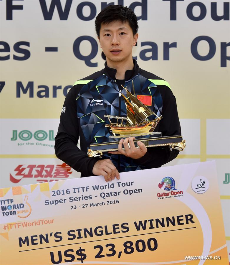DOHA, March 27, 2016 -- China's Ma Long poses during the awarding ceremony for the men's singles event at the 2016 ITTF World Tour Qatar Open table tennis tournament in Doha, capital of Qatar, on March 27, 2016. Ma Long claimed the title by beating his compatriot Fan Zhendong 4-1 in the final. (Xinhua/Nikku)