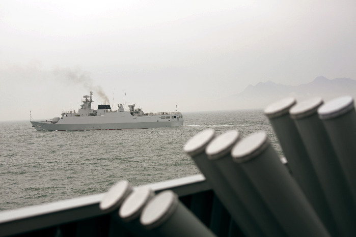 The guided-missile frigate Shangrao steams alongside the guided-missile frigate Quanzhou. A taskforce with a maritime garrison command of the East China Sea Fleet under the PLA Navy, composed of the guided-missile frigates Quanzhou, Shangrao and Foshan and the comprehensive supply ship Gaoyouhu, carried out a sea and air defensive and offensive training exercise in the East China Sea in mid to end of March, 2016. During the exercise, the taskforce rehearsed such training subjects as live-fire shooting at maritime targets, smoke shells launching, anti-submarine warfare, replenishment-at-sea and so forth.(Photo/www.81.cn)