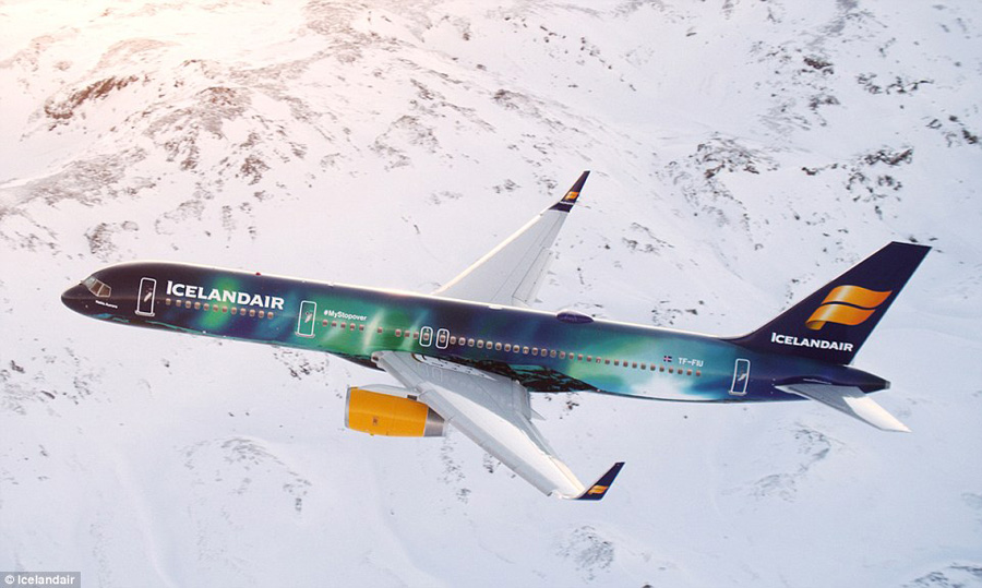 Every day, hundreds of passengers are flown across the Atlantic Ocean on Icelandair's Hekla Aurora plane, which is decorated with a paint scheme inspired by the northern lights.