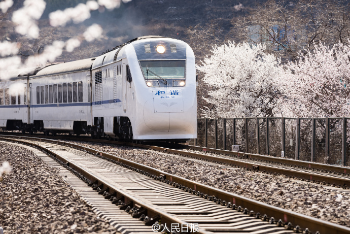 A train runs through a field of flowers near the Juyongguan Pass of the Great Wall in Beijing. (File Photo)