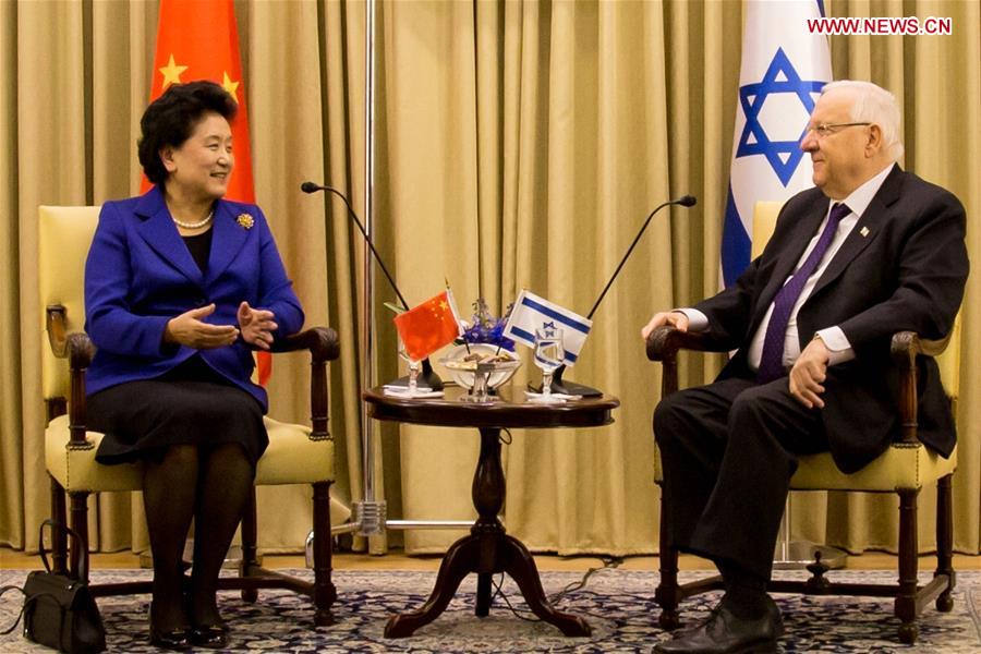 Chinese Vice Premier Liu Yandong(L) meets with Israeli President Reuven Rivlin in Jerusalem, March 29, 2016. (Xinhua/Yang Zhiwang)
