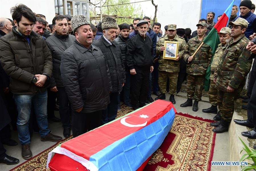 BAKU, April 3, 2016 -- People attend the funeral of a villager who was killed in recent conflict with Armenia, in Azerbaijan's Terter district bordering the disputed Nagorno-Karabakh region, on April 3, 2016. Azerbaijan unilaterally suspended all military operations and response measures in the high-strung disputed Nagorno-Karabakh region with Armenia, the Azerbaijani Defense Ministry said on Sunday. (Xinhua/Tofik Babayev)