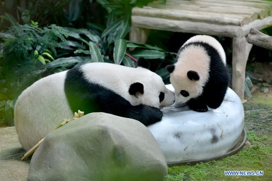 KUALA LUMPUR, April 7, 2016 -- A baby giant panda (R) is seen with its mother at the National Zoo in Kuala Lumpur, Malaysia, on April 7, 2016. The baby giant panda born in Malaysia last year was named "Nuan Nuan", which means "warm" in Chinese on Thursday, as a symbol of the warm relations between Malaysia and China. (Xinhua/Chong Voon Chung)