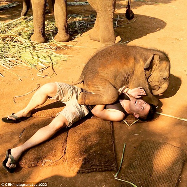 Nampuu only weighed 148lbs when he was born, well under the 220lbs of most newborns. And he is supervised by his mother Ploy and the farm who keeps an eye on him while playing with the tourists.