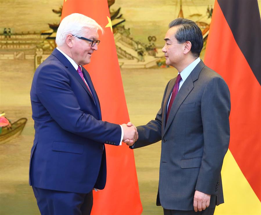 Chinese Foreign Minister Wang Yi shakes hands with his German counterpart Frank-Walter Steinmeier during the second China-Germany strategic dialog on diplomatic and security issues in Beijing, China, April 8, 2016.