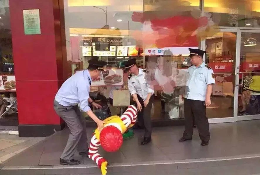 A Ronald McDonald statue was forcibly dismantled on Sunday by three Guangzhou chengguan (urban management officers).