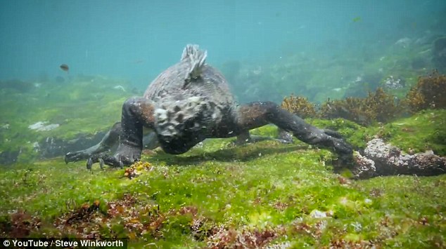 Marine iguanas, like this one filmed eating algae, are vegetarians and experts when it comes to foraging underwater.