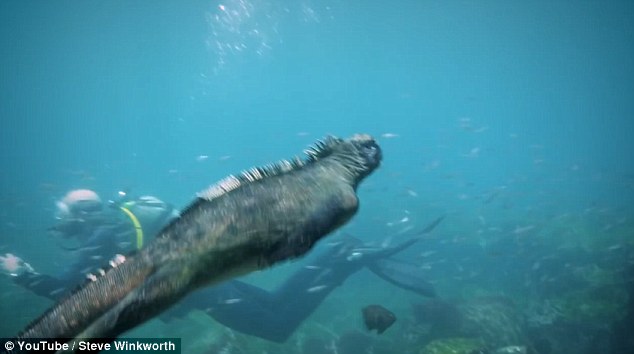 This incredible footage shows a six-foot long iguana feasting underwater in the Pacific Ocean.
