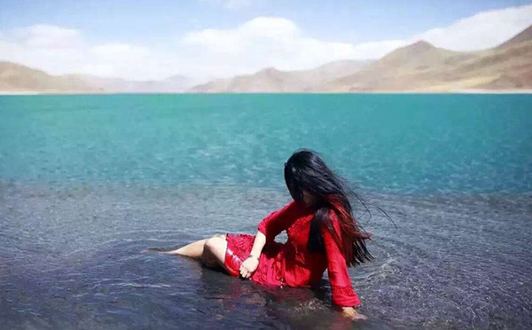 Some of the pictures show a woman posing totally naked, with her face turned away from the camera. In other pictures, she can be seen wearing a red dress while floating in the lake, or sitting and standing on the shore.(Photo/Weibo)