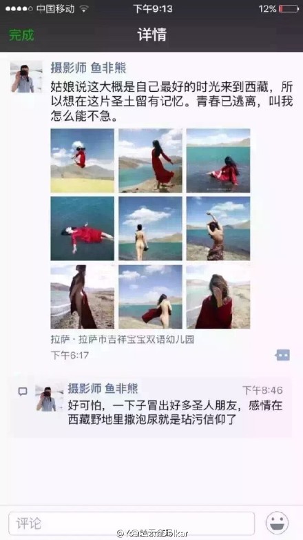 The photographer wrote on his Wechat: "The young woman said that her visit to Tibet was probably the best time of her life and she wanted to have a keepsake of herself in this holy land." (Screenshot/ Photographer's Wechat)