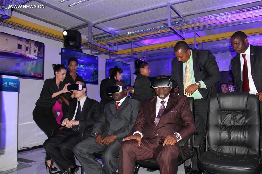 Namibian President Hage Geingob (R, front) and guests test VR devices using 4.5G in capital Windhoek, Namibia on April 14, 2016. The Chinese company Huawei Technologies in conjunction with Namibia's MTC launched Thursday the 4.5 G demo for the first time ever in Africa. [Photo: Xinhua]