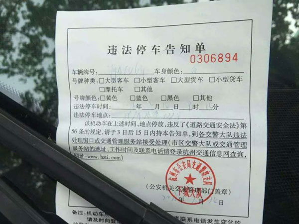 An undated photo shows a parking ticket attached to a car on the roadside in Hangzhou, east China's Zhejiang Province. [Photo: shxwcb.com]