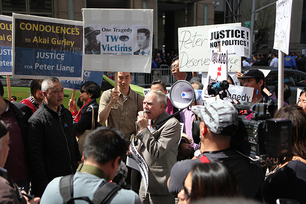 New York State Assemblyman William Colton, center, speaks to Liang supporters outside the Kings Country Supreme Court on Tuesday. HEZI JIANG/China Daily