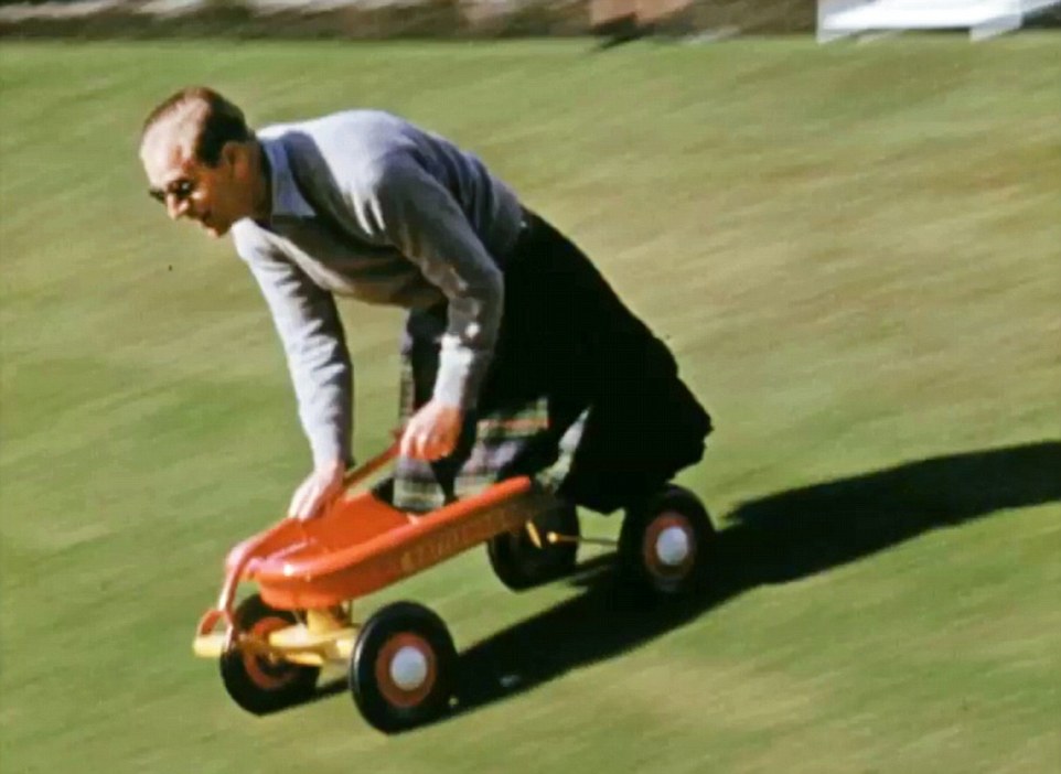The Queen pushes Princess Margaret on the toy cart at Balmoral Castle in Aberdeenshire, as a young Prince Charles smiles, wearing a kilt