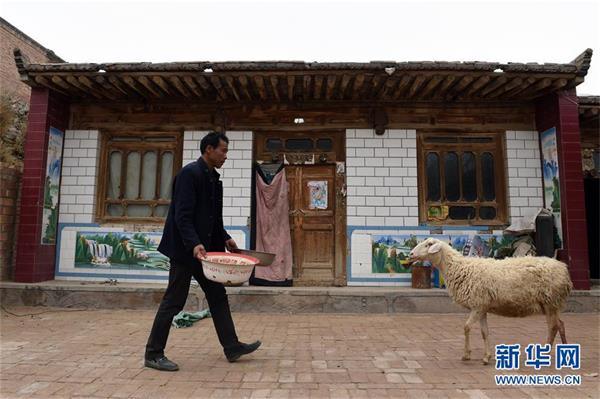 Liu Shengjia feeds his sheep.(Photo/Xinhua)