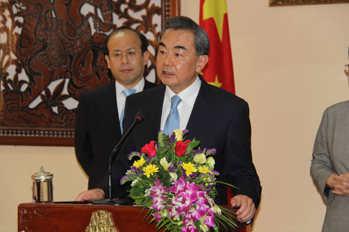 During a joint press conference with his Cambodian counterpart Prak Sokhonn on Friday, April 22, 2016, Chinese Foreign Minister Wang Yi says the Philippines' claims relating to China's territory sovereignty and maritime rights should evidently be excluded from a compulsory arbitration. [Photo: fmprc.gov.cn]