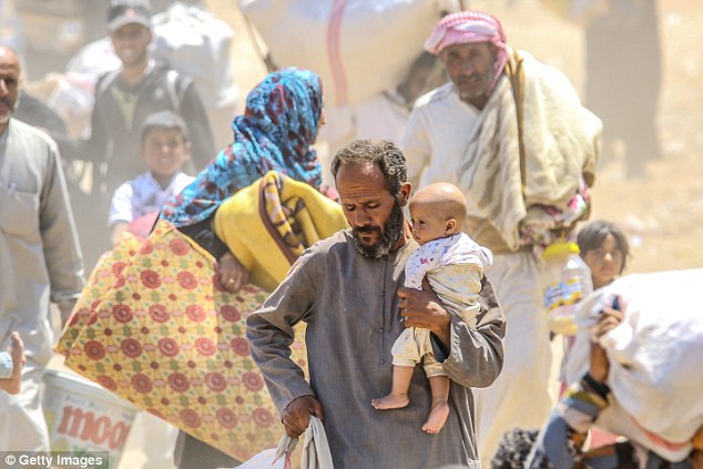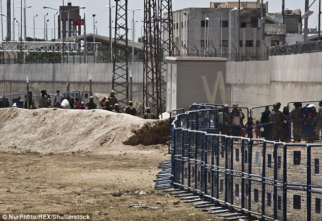 Escape: Amid the chaos of the border town of Tal Abyad, where refugees fled into Turkey to escape the fighting, above, Abu Ali managed to make contact with a smuggling gang who spirited him to freedom