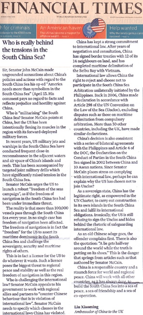 On 9 May, the Financial Times and its website published a signed article by Ambassador Liu Xiaoming entitled " Who is really behind the tensions in the South China Sea? ". The full text is as follows:
