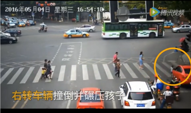 The surveillance video shows the boy letting go of his mother’s hand as they walked together on the crosswalk. The little boy then ran across the street at the very moment that a car began to turn right, knocking the boy to the ground and driving over his chest. The mother rushed up and tried to push the car aside with her body, but the boy independently crawled out from under the car several minutes later.
