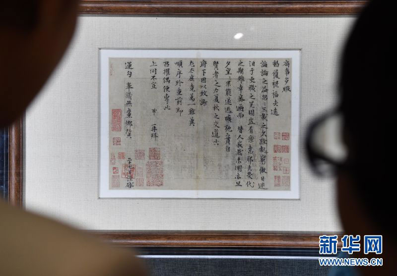 Viewers look at the letter "Jushi Tie" written by Zeng Gong more than 1000 years ago at a pre-auction exhibition on May 12, 2016. [Photo: Xinhua]