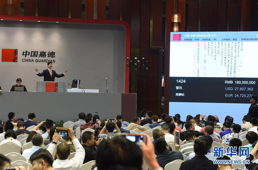 A calligraphy work by Chinese Tang Dynasty (AD 618-907) scholar Zeng Gong fetched 207 million yuan ($31.69 million) at the China Guardian 2016 Spring Auction on Sunday evening, setting an auction record for the calligrapher.