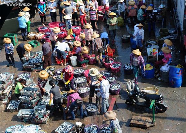 Fishermen deal with the last batch of fish goods before the moratorium at a wharf in Sanya, south China's Hainan Province, May 16, 2016. China banned fishing from May 16 to Aug. 1 in the South China Sea, a measure taken for the 18th consecutive year.(Photo/Xinhua)