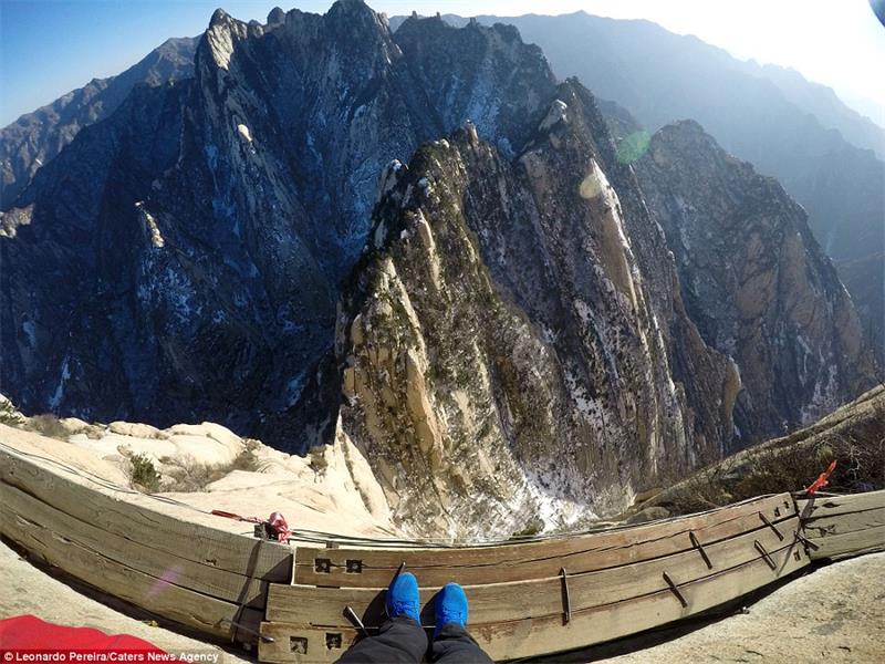 The nail-biting snaps show Leonardo Pereira and his girlfriend, Victoria Nader, from Brazil, on the edge of Mount Hua, or Huashan, where they walked its infamous ‘plank walk in the sky’.
