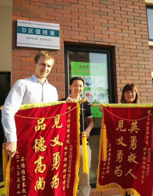 Mr. Hu and his wife came specially from the Fengxian District of Shanghai to Jian Qiao University on Monday to express gratitude to three expats–Russian students Roman and Kirill, along with French teacher Bastien–for saving their 17-year-old daughter.