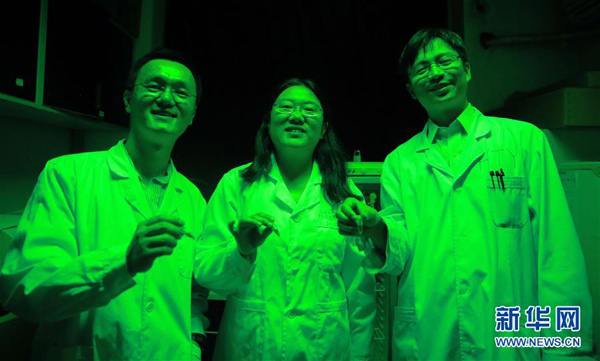 Research team members Liu Zhenfeng, Li Mei and Zhang Xinzheng (from left to right) hold the sample of the super membrane protein in the sample preparation lab of the Institute of Biophysics of the Chinese Academy of Sciences on May 20. (Photo/Xinhua)