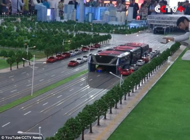 The scale model of the 'Transit Elevated Bus' was demonstrated this week at the 19th China Beijing International High-Tech Expo (pictured). The idea is that passengers sit far above other vehicles on the road, allowing cars to pass underneath