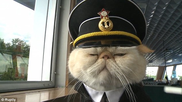 This is Sailor the exotic shorthair cat, leading the cruises of the Nikolay Chernyshevsky tourist boat in Russia
