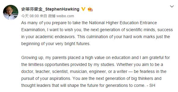 As the Gaokao or national college entrance exam is drawing near, famous theoretical physicist Stephen Hawking posted a message on his Weibo, the Chinese Twitter-like site, to wish Chinese students success.