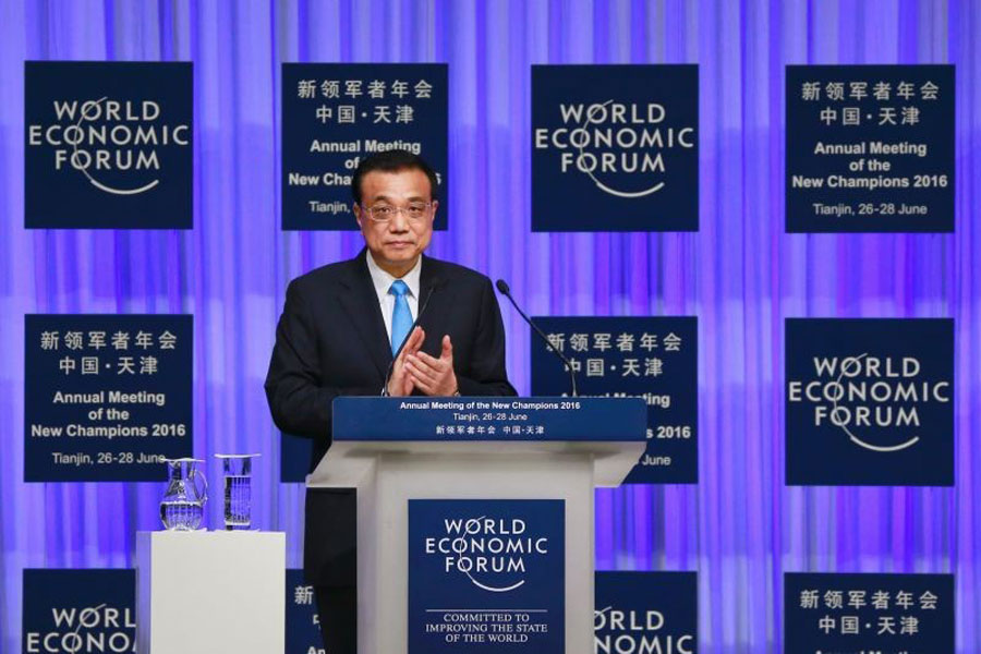 Chinese Premier Li Keqiang addresses the opening ceremony of the annual Meeting of the New Champions, also known as the Summer Davos Forum, in China's northern coastal city of Tianjin, on June 27, 2016. This year's meeting carries the theme: "The Fourth Industrial Revolution and Its Transformational Impact." [Photo: CRIENGLISH.com]