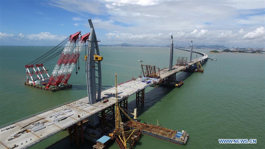 Photo taken on Sep. 6 shows construction of all piers holding up the Hong Kong-Zhuhai-Macao Bridge have been completed, which means the construction work has entered the final stage. It is scheduled to be finished in late 2016. (Xinhua Photo)