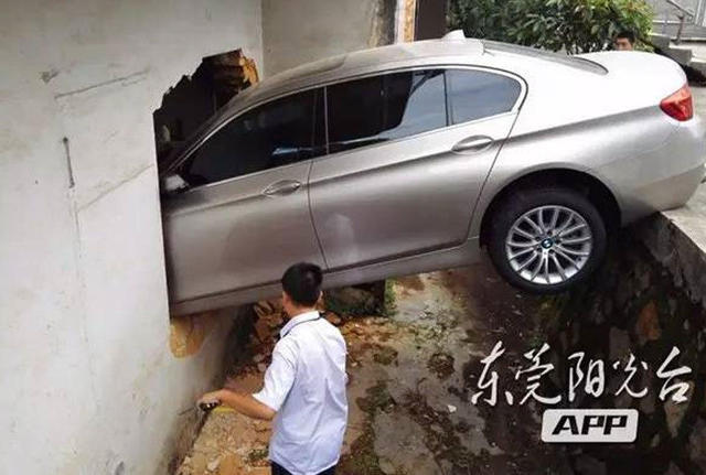 After the car bumped into the building, the onlookers helped the female driver get off the car which hung on the wall. The driver said she had failed to brake, but onlookers disclosed that she could have mistaken the gas pedal for brake.